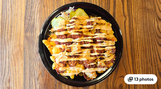 Fiery Fries . 2 chopped chicken tenders served with topping of the fries and mac and cheese.