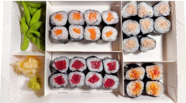 Salmon 8 pcs, Tuna 8 pcs, Blue Crab 8 pcs, Spicy Tuna 4 pcs