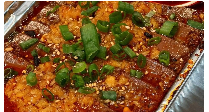 Tender duck blood tofu in a rich, spicy sauce, garnished with chopped green onions and sesame seeds.