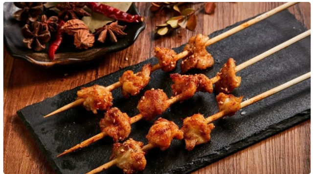 Crispy, marinated chicken pieces skewered and grilled to a golden brown.