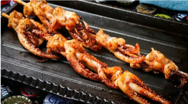 Grilled squid tentacles skewered, featuring tender and lightly charred pieces with a savory seasoning.